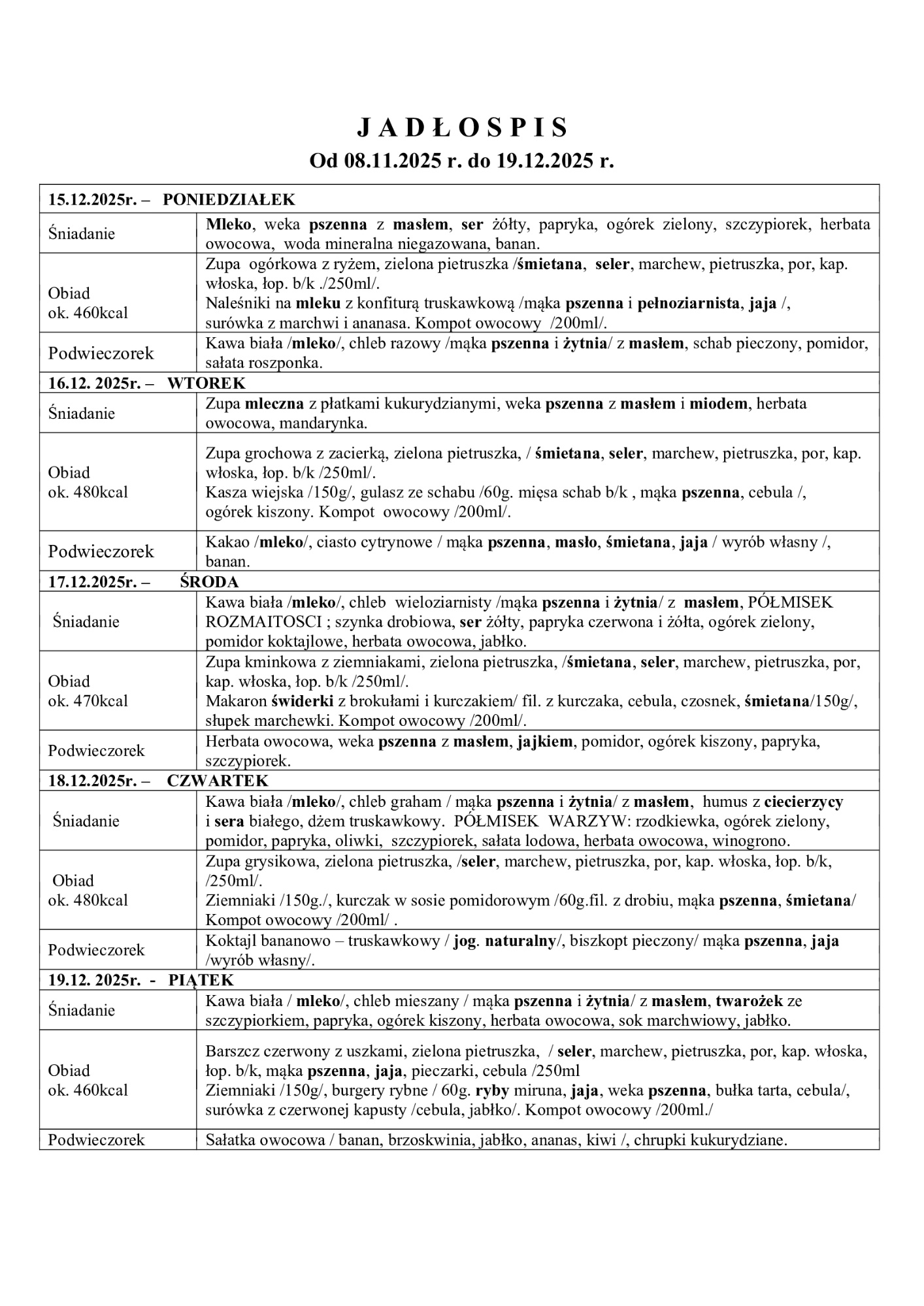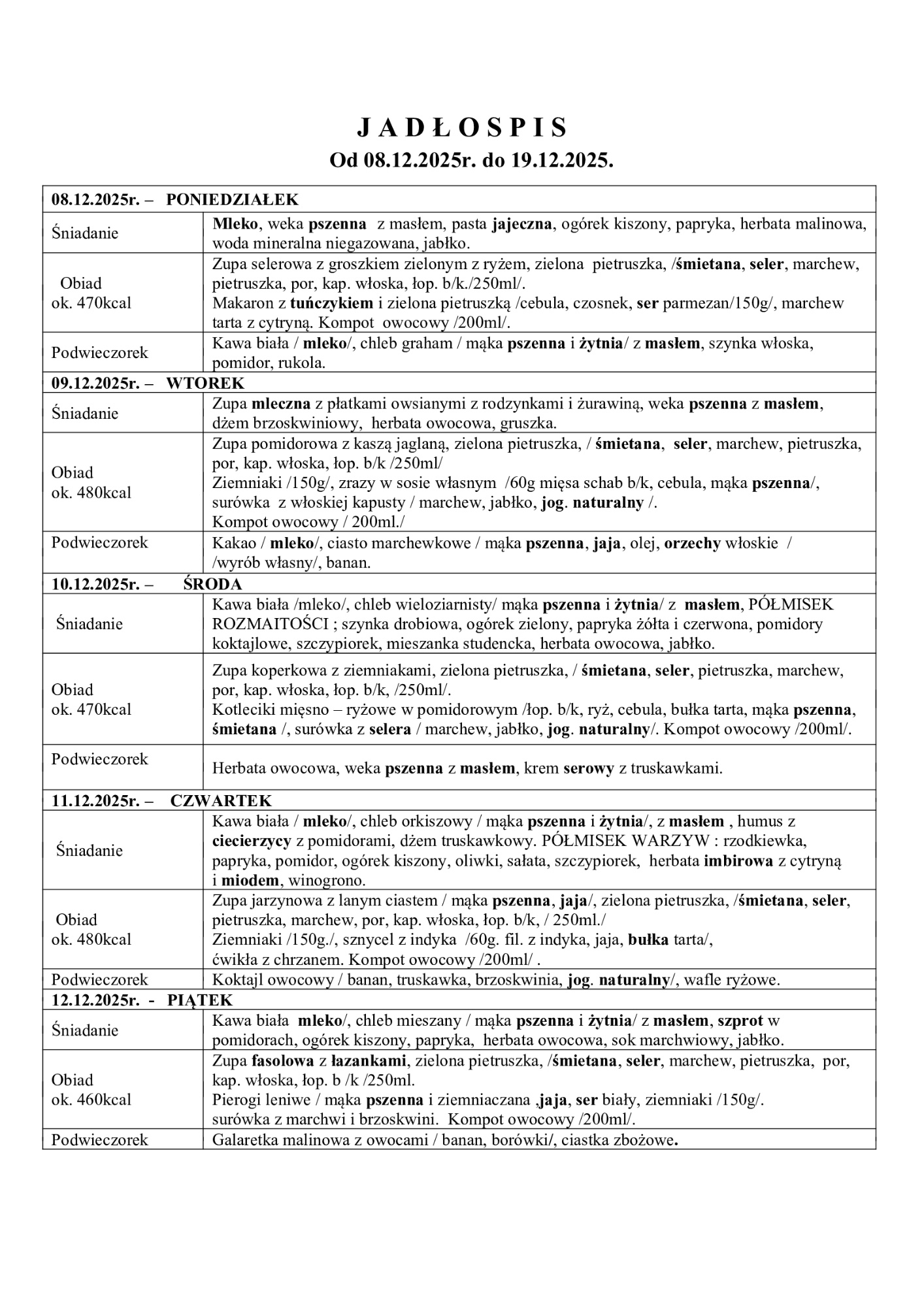 Składniki kompotu owocowego - truskawka, jabłko, mieszanka kompotowa (czarna porzeczka, aronia, agrest, śliwki).Wywar zup mięsno - jarzynowy- seler, marchew, pietruszka, por, kap. włoska, pieczeń wołowa + główny składnik danego dnia. Makarony Lubella, świderki, muszelki, kokardki, nitki- mąka makaronowa pszenna.